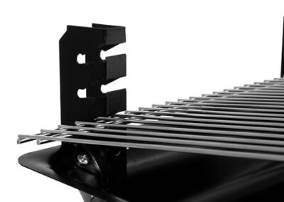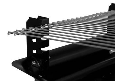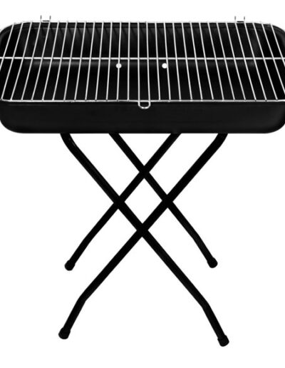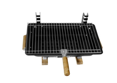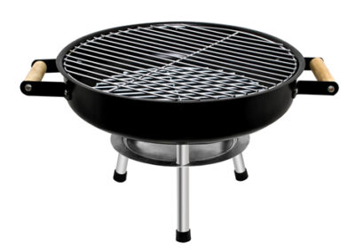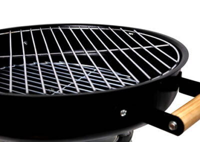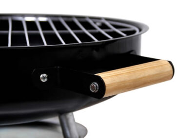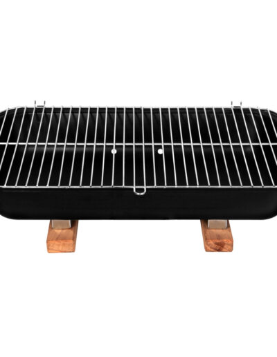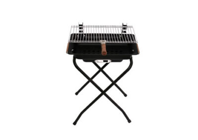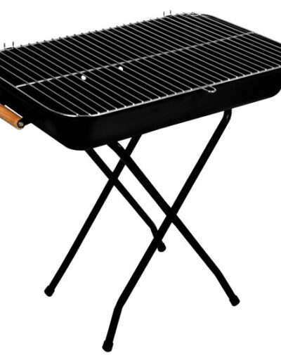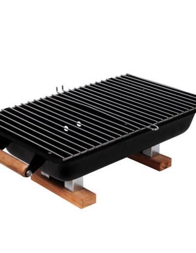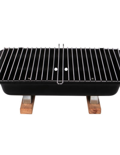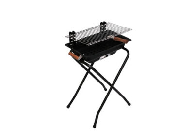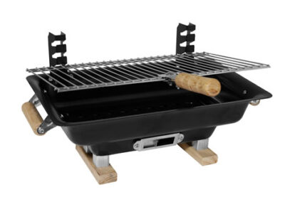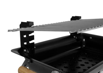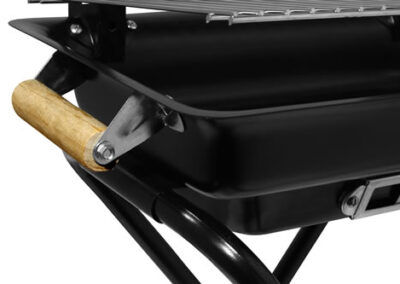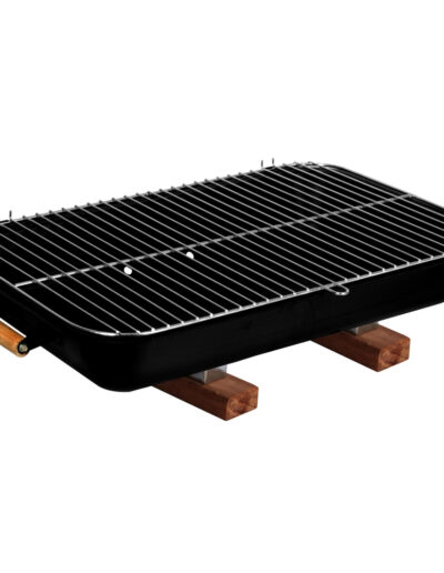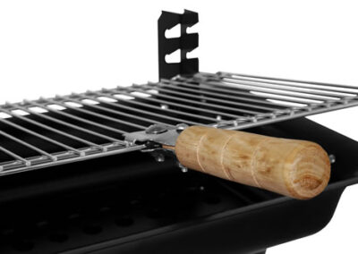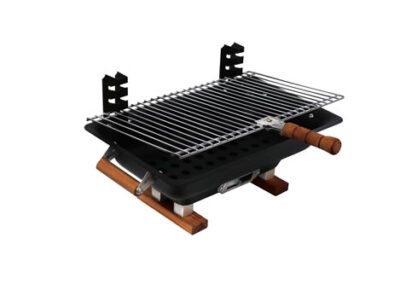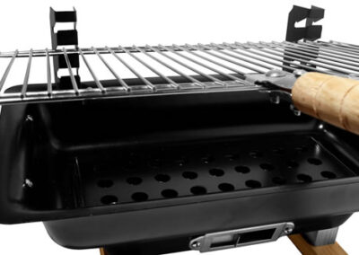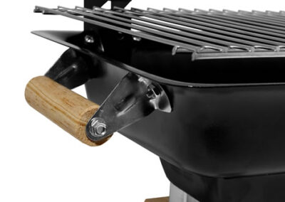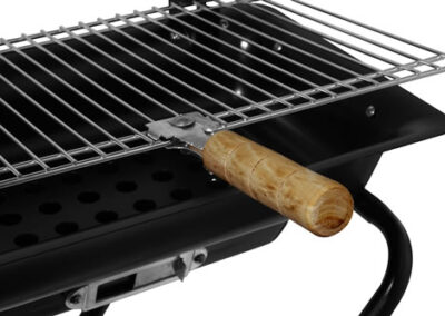 Práctica parrillera portátil a carbón con ó sin, fabricada en resistente lámina de hierro tratada químicamente para evitar la oxidación, con decorativas asas laterales en madera. Bandeja portacarbón en color negro microtexturizado, equipada con bandeja de cenizas desmontable y ventanilla de control entrada de aire. Parrilla cromada graduable de cuatro posiciones para regular la cocción de los alimentos, con asa de madera para su fácil manipulación.