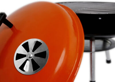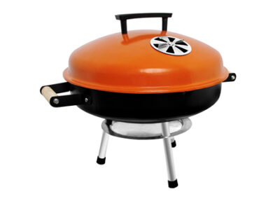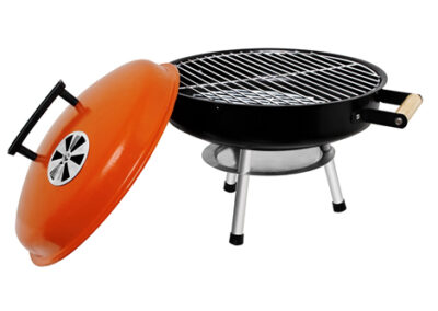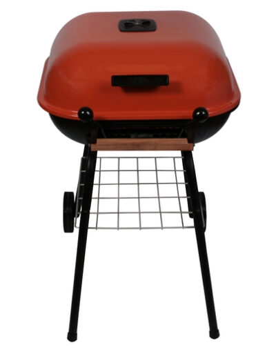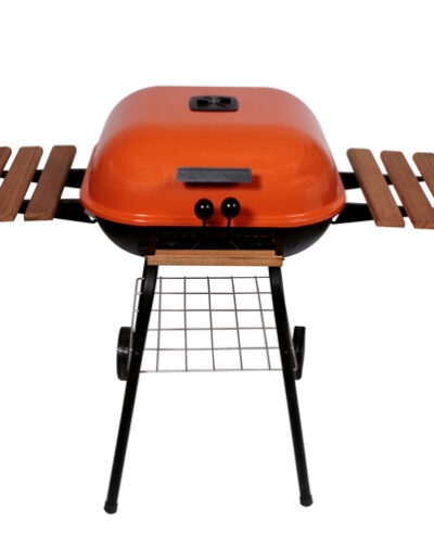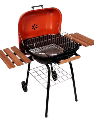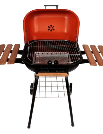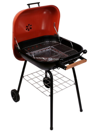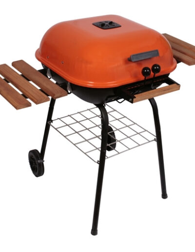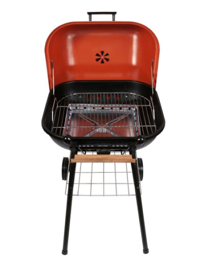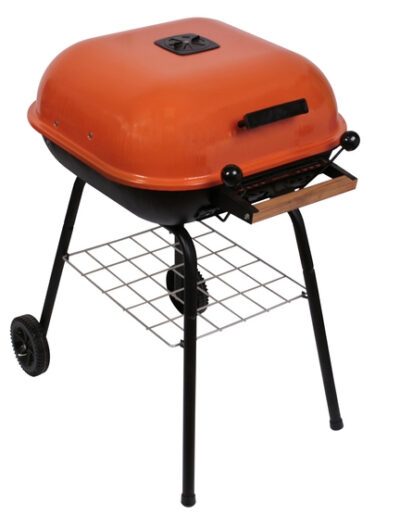 Parrillera a carbón de calidad superior, fabricada en resistente lámina de hierro de alto espesor tratada químicamente para evitar su oxidación, con decorativa asa de madera que facilita su movimiento mediante ruedas plásticas traseras. Tapa Superior basculante en color anaranjado texturizado pintada al horno con asa plástica en Nylon y mariposa reguladora de salida de aire. Tapa inferior en color negro microtexturizado horneada equipada con doble ventanilla graduable de entrada de aire para la óptima combustión del carbón. Con bandeja porta carbón galvanizada, parrilla inferior galvanizada para práctica disposición de sus utensilios de cocción y Parrilla cromada graduable en cuatro posiciones para la óptima cocción de sus alimentos. Ideal para su uso “out door”.